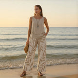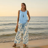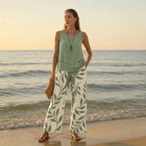 Set coordinato con top smanicato e pantaloni a gamba larga con elegante stampa botanica. Comfort e stile per ogni occasione.